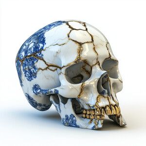 «A broken human skull of Lisbon white and blue porcelain, with no...»