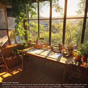 «"Create a hyper-realistic scene of a cozy, sunlit art studio sur...»