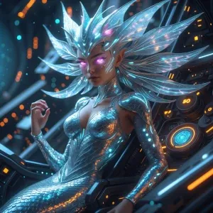 «A shimmering, technologically sophisticated Merfolk ruler, exudi...»