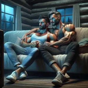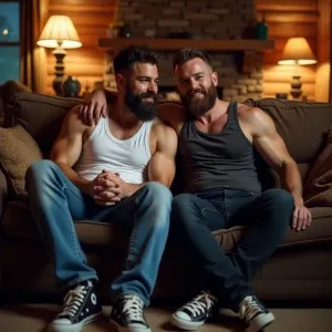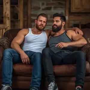 «Two rugged men, John and Bobby, exuding masculinity with their m...»