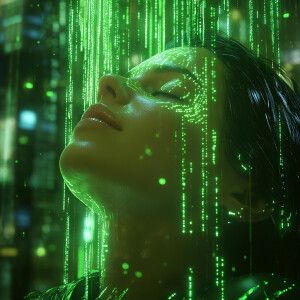 «A close-up hyper-realistic image of a woman immersed in a futuri...»