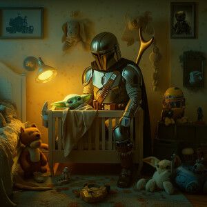 «The Mandalorian character Djin Djarin, put baby Yoda in its crib...»
