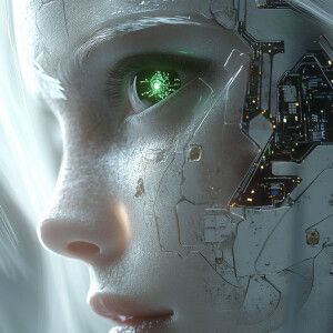 «A hyper-ultra-realistic close-up of a futuristic cyborg woman's...»