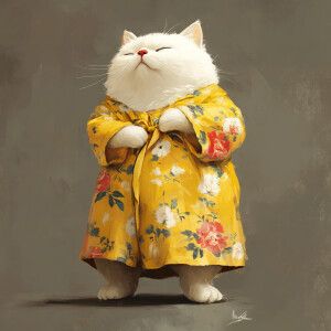 «A white cat wearing a yellow floral patterned nightgown is stand...»