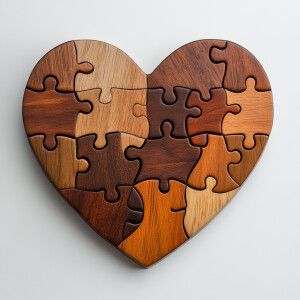 «A wooden puzzle shaped like a heart with interlocking pieces, se...»