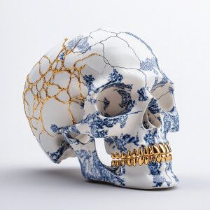 «Hyper-realistic 3D rendering of a fragmented human skull crafted...»