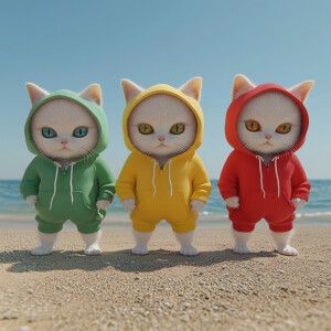 «Three small antrophomorpic cream kittens 3d wearing red, yellow...»