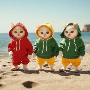 «Three cream colored kittens wearing red, yellow and green hoodie...»