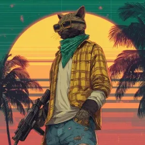 «A humanoid cat character with sleek, silver fur, dressed in a st...»