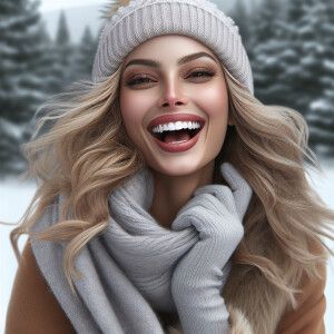 «Photorealistic photo of beauthiful woman, smiling or laught, win...»