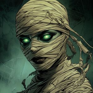 «Create an illustration of an mummy woman with glowing green eyes...»