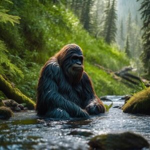 «Sasquatch relaxing in a forest creek as it bathes, surrounded by...»