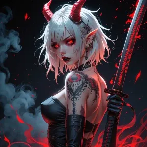 «Anime style, beautiful female demon with messy white hair, glowi...»