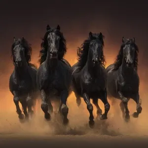 «A hyper-realistic 4K digital painting of four black horses runni...»