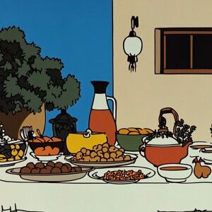 «Animation, close-up of Arabic food on the home table --sref 1742...»