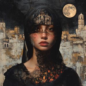 «"A close-up image of a human face with golden, shimmering makeup...»