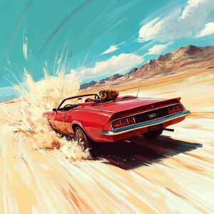 «A lion speeding through the desert in a red Camaro convertible,...»