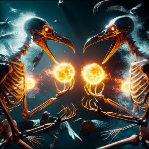 «Two zombie crow skeletons engage in a fiery battle, shooting vib...»