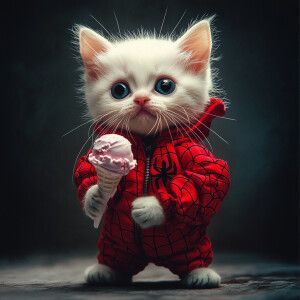 «White kitten with fluffy fur enjoying a scoop of vanilla ice cre...»