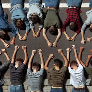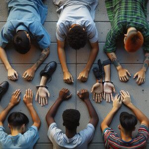 «6 white male teens, laying face down on the ground on a side wal...»