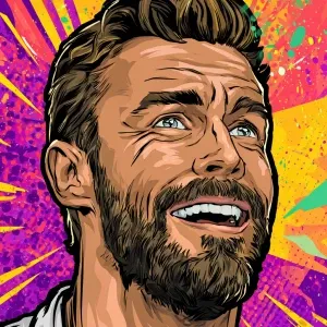 «White muscular thin man with beard, big chin, smile and cheekbon...»