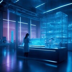 «Design a futuristic laboratory scene in a realistic 3D-rendered...»