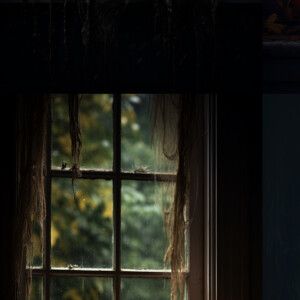 «A hauntingly realistic image of a pumpkin resting on a windowsil...»