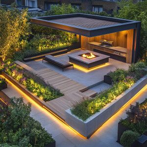 «Design a modern rooftop garden that includes a gazebo, barbecue...»