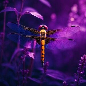 «Create an image of a dragonfly with vibrant purple wings and a m...»