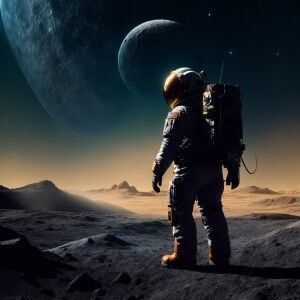 «Create a concept art line drawing of a moon miner on a dimly lit...»