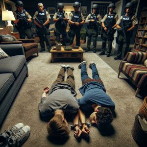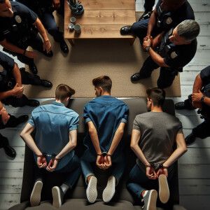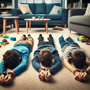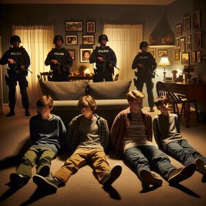 «3 caucasian male boys handcuffed, laying flat face down on the g...»