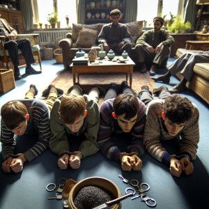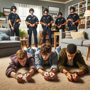 «4 caucasian male teens handcuffed, laying flat face down on the...»