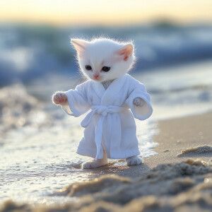 «A white kitten with black eyes wearing a white robe wearing sand...»
