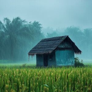 «heavy rain in a hut in the middle of a rice field, the weather w...»