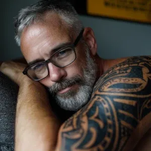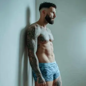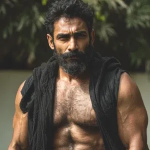 «The image shows a man with a muscular, hairy physique standing o...»