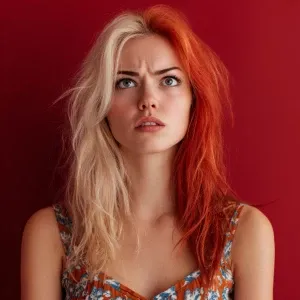 «Female supermodel with half blonde half red hair. She has a conf...»