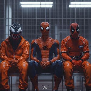 «Create a 3D image of Spider-Man, Venom, and Deadpool sitting sid...»
