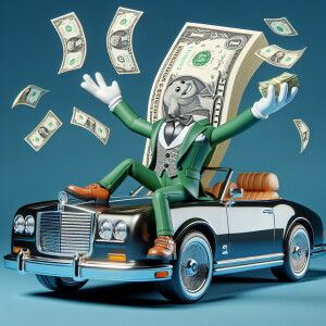 «An anthropomorphic dollar bill character, clad in a tailored gre...»