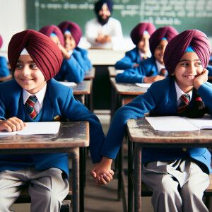 «Punjabi boy with a girl in school uniform sitting on Same desks...»
