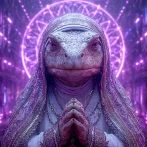 «sparkling diamond encrusted frog dressed as a nun, in misty chur...»