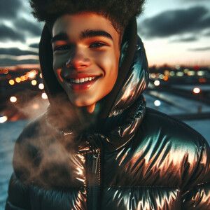 «Teen man, mini afro fade side hair, wearing a puffer jacket»