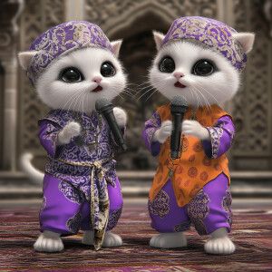 «two small white kittens, black eyes, wearing purple and orange k...»
