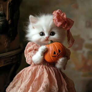 «white kitten holding a pumpkin doll»