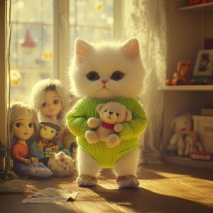 «Realistic small white kitten wearing a neon green sweater wearin...»