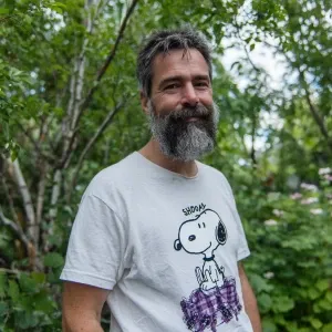 «The image shows a 45 year old man with a beard black hair with s...»