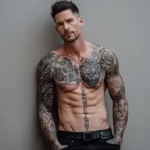«Create an image featuring a muscular, bald man sporting a full b...»