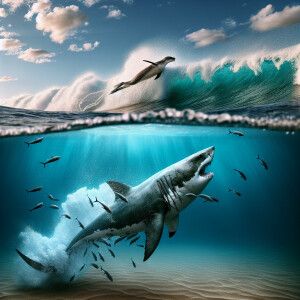 «Half-submerged split-view of a great white shark pursuing a seal...»