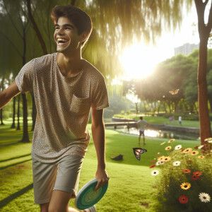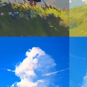 «Japanese college girl on a grassy field with blue sky and white...»