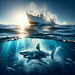 «Half-submerged split-level effect of a great white shark pursuin...»