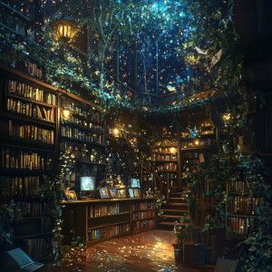 «Design an enchanted bookshop interior that transforms at night,...»